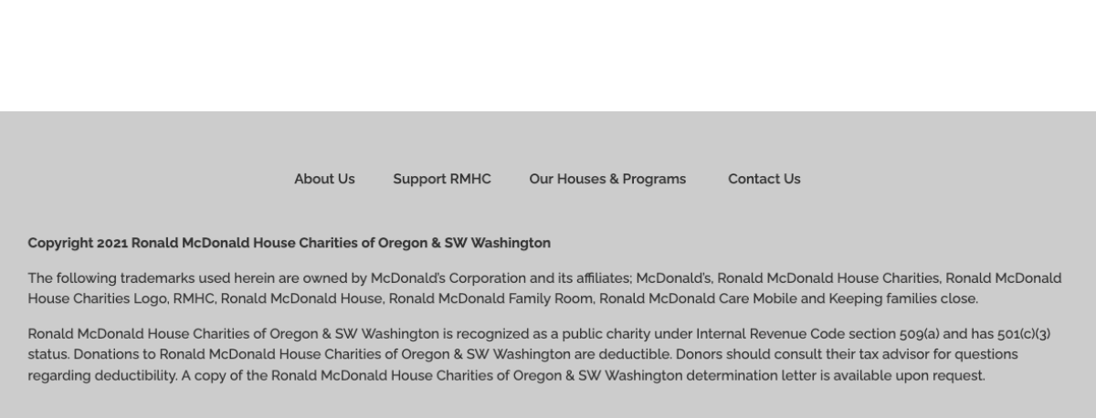 The following trademarks used herein are owned by McDonald’s Corporation and its affiliates; McDonald’s, Ronald McDonald House, Ronald McDonald House Logo, RMHC, Ronald McDonald Family Room, Ronald McDonald Care Mobile and Keeping families close. Ronald McDonald House Oregon is recognized as a public charity under Internal Revenue Code section 509(a) and has 501(c)(3) status. Donations to Ronald McDonald House Oregon are deductible. Donors should consult their tax advisor for questions regarding deductibility. A copy of the Ronald McDonald House Oregon determination letter is available upon request.